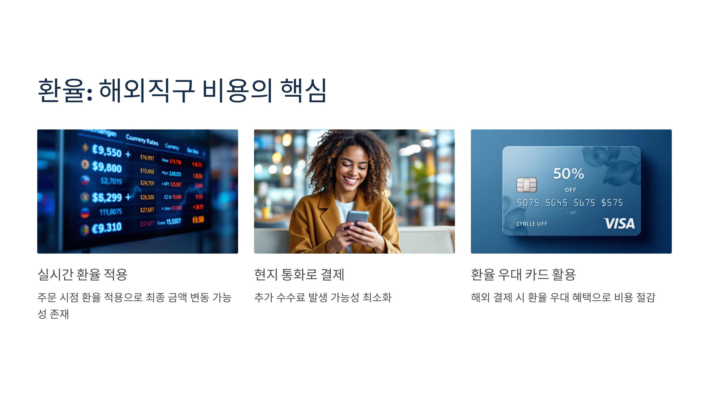- 환율 우대 카드 활용하기: 해외 결제 환율 우대 혜택을 제공하는 카드 사용.