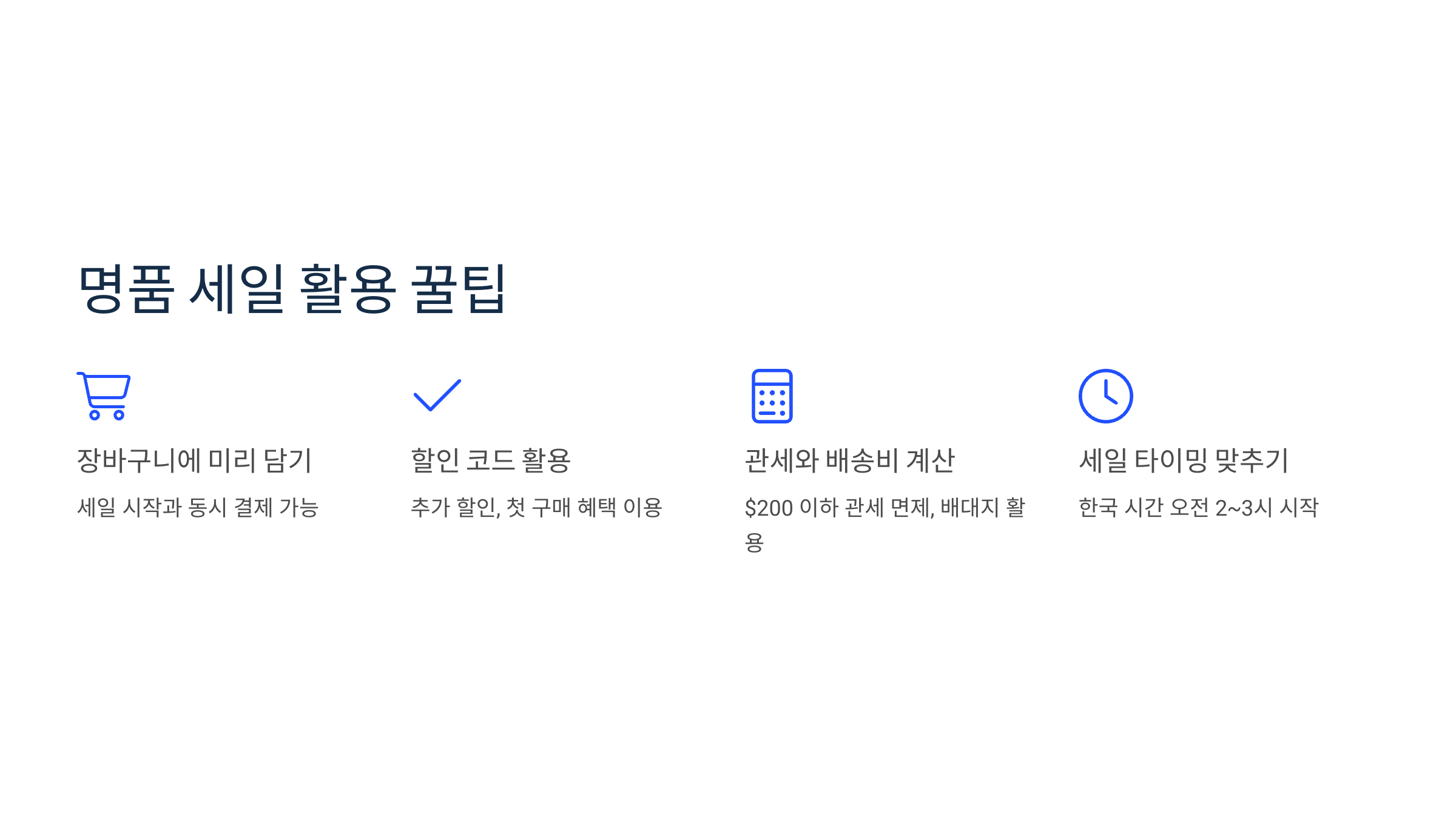 - 대부분의 명품 쇼핑몰은 미국 동부 시간 자정(한국 시간 오전 2~3시)부터 세일 시작.